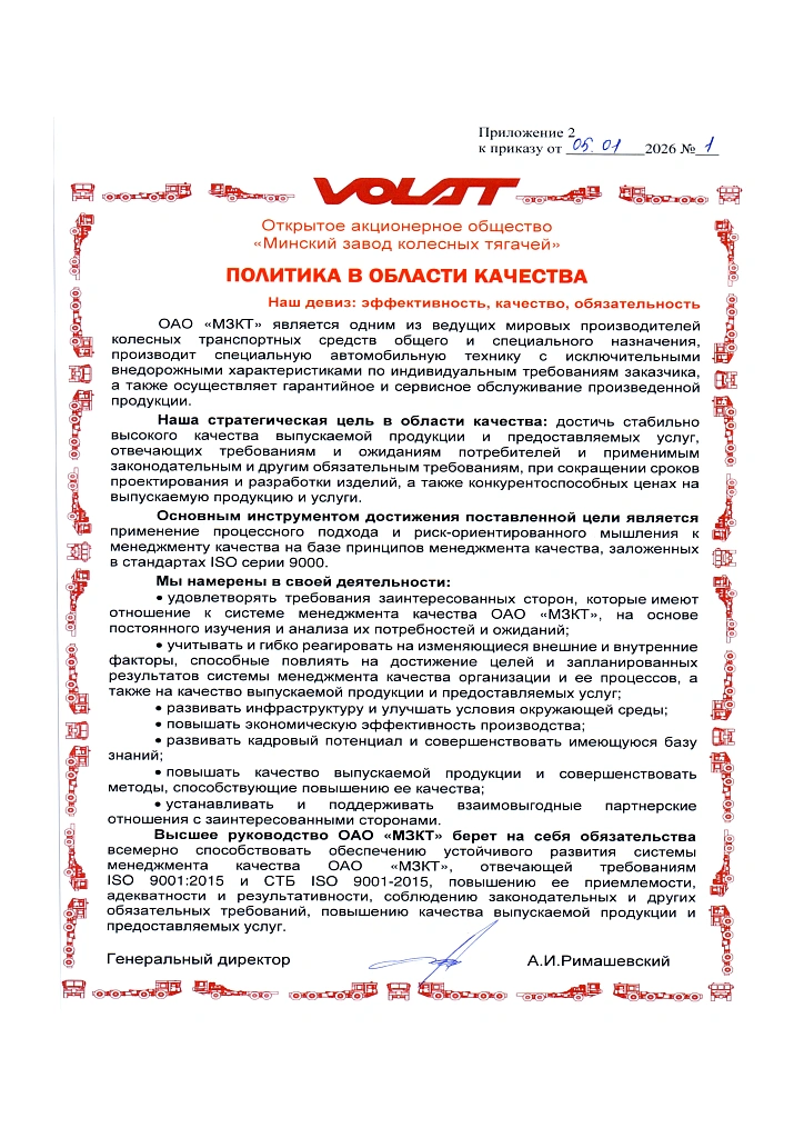 MZKT OJSC pays great attention to the quality of products supplied to the consumer. Therefore, back in 2000, a quality management system was introduced and certified in 2001 for compliance with the requirements of the international standard ISO 9001 in the German TÜV CERT system and the requirements of STB ISO 9001 in the National Certification System of the Republic of Belarus.